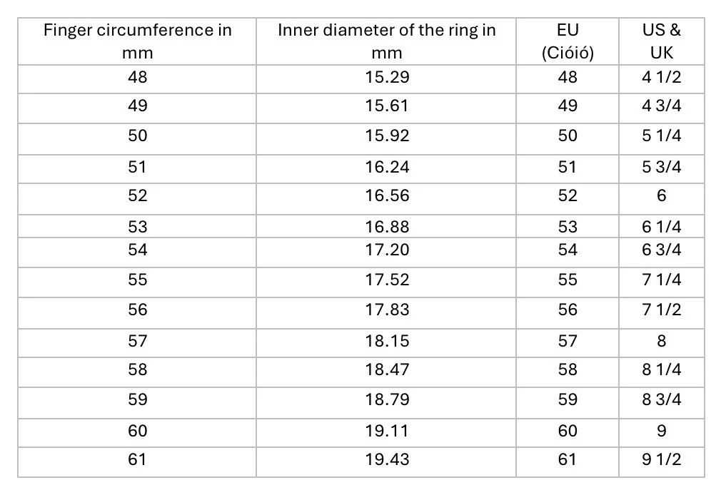 At Cióió, ring sizes are measured based on the rings inner circumference in millimeters. For example, a size 54 ring corresponds to a 54 mm circumference.